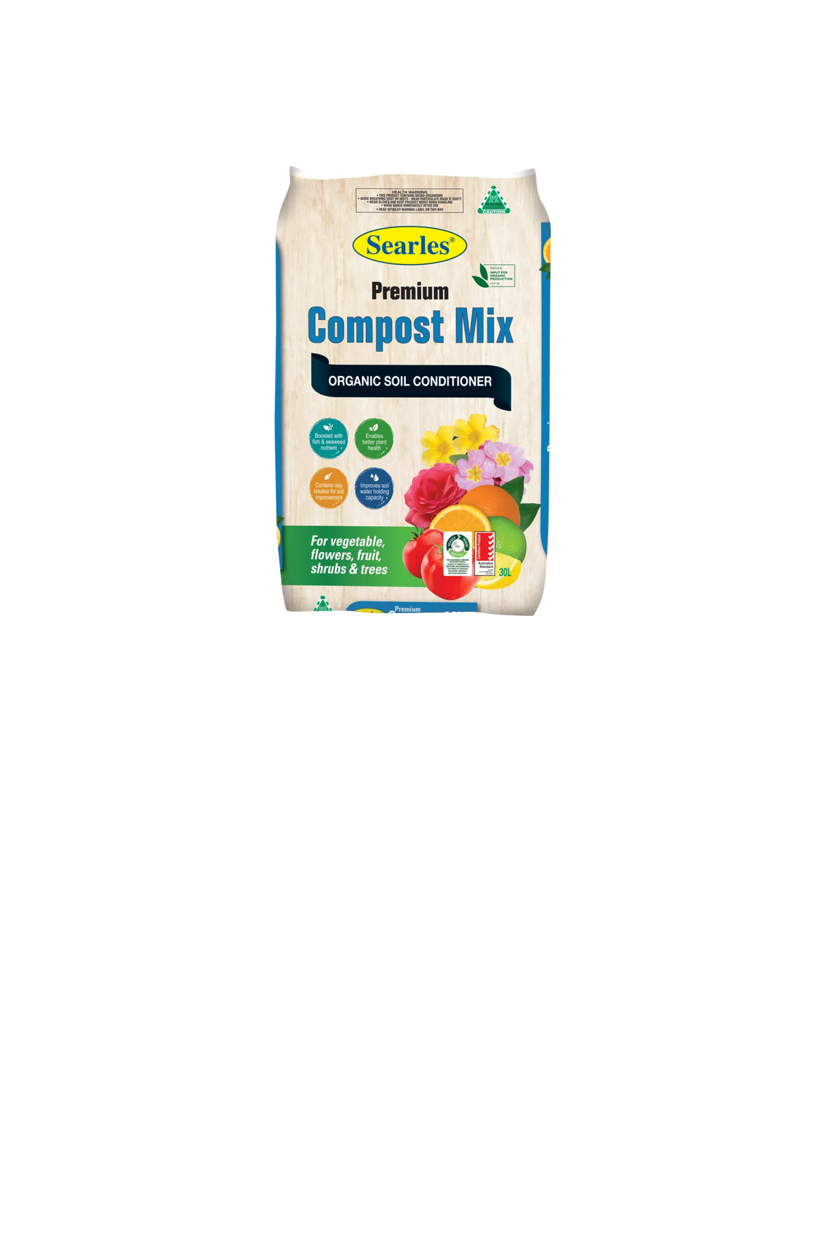 The Searles Premium Compost Mix 30 L is an expertly blended, certified organic compost designed to improve garden soils across a broad range of applications — from vegetable patches and fruit trees, to flower beds, shrubs and trees. With its rich humus content, built-in clay-breaker, and boost of fish & seaweed it helps revitalise heavy clay soils, poor sandy soils and tired garden beds.