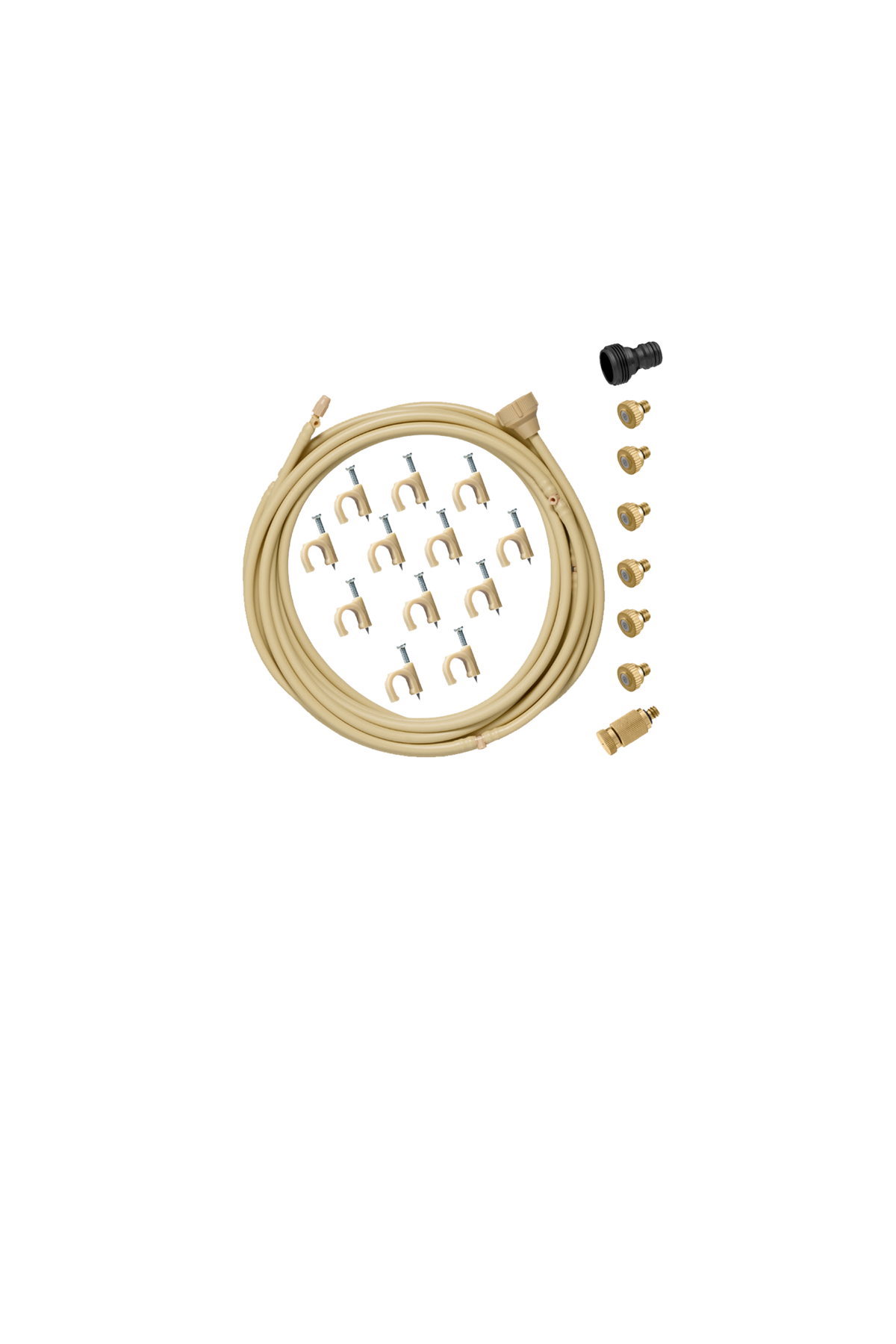 Beat the heat in your outdoor living spaces with the Orbit Professional Outdoor Mist Kit. This ready-to-install mist cooling system comes with 3.7 metres of pre-assembled UV-resistant tubing, brass and stainless steel misting nozzles, and simple installation: attach to your tap, secure tubing with clips, and you’re set.
